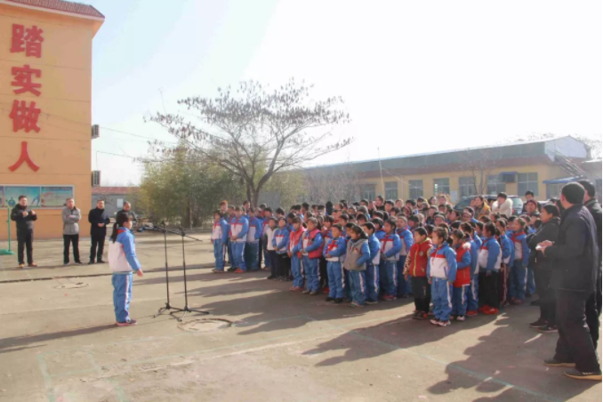 11時(shí)整,全校老師和同學(xué)們相聚在學(xué)校操場(chǎng),愛心捐贈(zèng)活動(dòng)正式開始,出席本次捐贈(zèng)活動(dòng)的有:九三學(xué)社的劉彥濤秘書長、侯家華主委、泰安市化馬灣鎮(zhèn)教委彭主任與健源生物董事長王誠先生、總經(jīng)理助理兼辦公室主任王玲女士。學(xué)校張校長對(duì)九三學(xué)社與山東健源生物科技有限公司的捐贈(zèng)表示感謝,感謝九三學(xué)社以及社會(huì)各界對(duì)學(xué)校教育的關(guān)注和支持,感謝在寒冬里送來溫暖和祝福。并告誡全校師生要懂得感恩,將這份愛心傳遞下去。