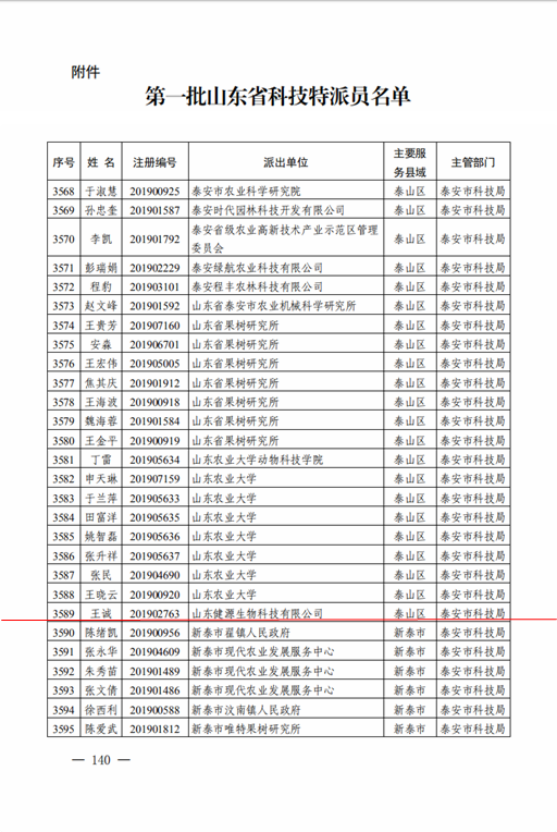 發(fā)布時間:[2020-6-22 14:58:2] 瀏覽量:3343次為深入貫徹習近平總書記對科技特派員制度推行20周年作出的重要指示精神,落實科技特派員制度推行20周年總結(jié)會議、全省科技特派員工作會議要求,按照《關于打贏脫貧攻堅戰(zhàn)三年行動工作方案》、《關于深入推進科技扶貧助力鄉(xiāng)村振興若干措施》和《關于組織開展科技特派員注冊工作的通知》部署安排,進一步加強科技特派員選派工作,現(xiàn)名單予以公布,山東健源生物科技有限公司董事長王誠被選任為第一批山東省科技特派員。