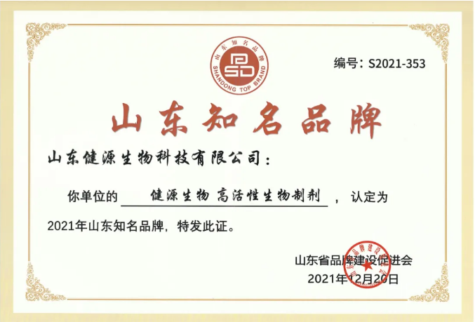 根據(jù)《山東知名品牌認定管理辦法》的規(guī)定,遵循科學(xué)、客觀、公開、公平、公正、自愿的原則,經(jīng)組織申報、資格審查、大數(shù)據(jù)信息挖掘、信息化系統(tǒng)平臺評審、專家評審、專家委員會審議、認定委員會認定等工作程序,山東健源生物科技有限公司申報的“健源生物高活性生物制劑”被認定為2021年山東知名品牌。