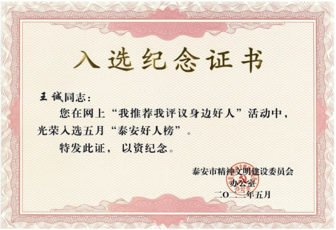 一、王誠(chéng)董事長(zhǎng)光榮入選五月“泰安好人榜”——由泰安市精神文明建設(shè)委員會(huì)頒發(fā)