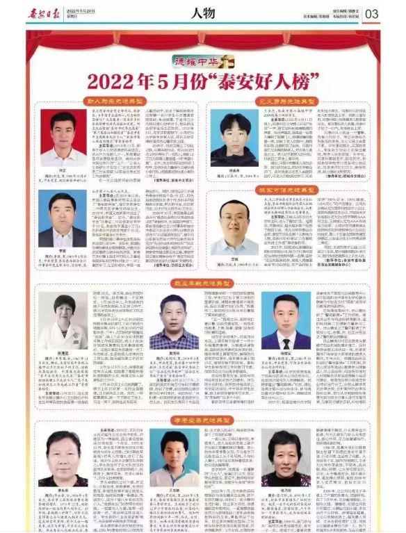 《泰安日?qǐng)?bào)》發(fā)布2022年5月份“泰安好人榜”