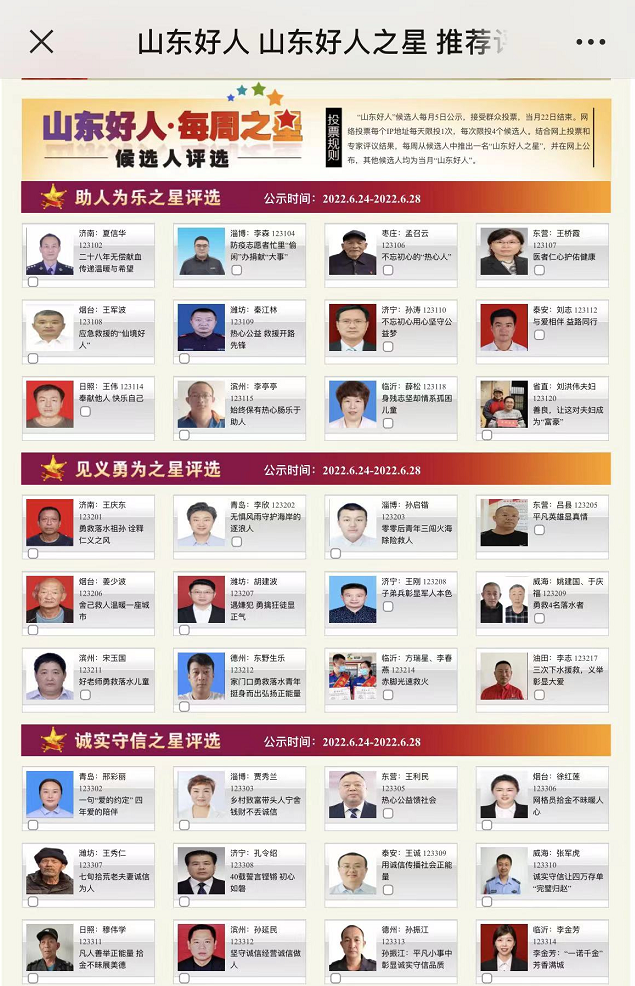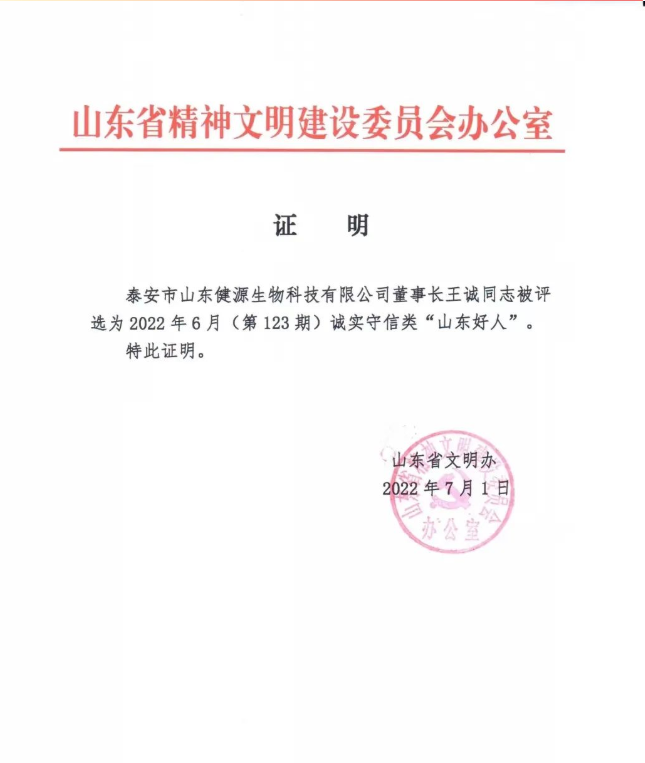 為深入貫徹落實(shí)黨的十七屆六中全會(huì)精神,推動(dòng)學(xué)雷鋒活動(dòng)常態(tài)化,推進(jìn)公民思想道德建設(shè),公民道德素質(zhì)和社會(huì)文明程度,努力建設(shè)“美德山東”,根據(jù)省委辦公廳《關(guān)于深入開(kāi)展學(xué)雷鋒活動(dòng)的實(shí)施意見(jiàn)》(魯辦發(fā)[2012]6號(hào))精神,在全省廣泛開(kāi)展“山東好人——每周之星”評(píng)選活活動(dòng)由省委宣傳部、省文明辦、大眾報(bào)業(yè)集團(tuán)、省總工會(huì)、團(tuán)省委、省婦聯(lián)、山東廣播電視臺(tái)聯(lián)合主辦。山東健源生物科技有限公司王誠(chéng)董事長(zhǎng)被評(píng)選為2022年6月(123期)誠(chéng)實(shí)守信類“山東好人”。