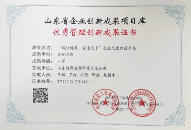 山東健源生物榮獲山東省企業(yè)創(chuàng)新成果項(xiàng)目庫(kù)優(yōu)秀管理創(chuàng)新成果一等獎(jiǎng)