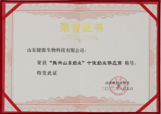 山東健源生物科技有限公司榮獲“振興山東奶業(yè)”十佳奶業(yè)供應商 稱號