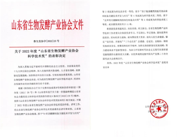 【喜報(bào)】山東健源生物榮獲山東省生物發(fā)酵產(chǎn)業(yè)協(xié)會(huì)科學(xué)技術(shù)獎(jiǎng)一等獎(jiǎng)