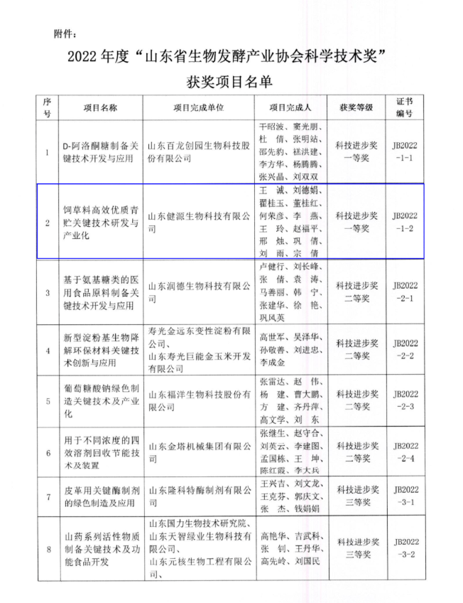 按照《山東省生物發(fā)酵產(chǎn)業(yè)協(xié)會(huì)科學(xué)技術(shù)獎(jiǎng)獎(jiǎng)勵(lì)章程》相關(guān)規(guī)定,開展2022年度山東省生物發(fā)酵產(chǎn)業(yè)協(xié)會(huì)科學(xué)技術(shù)獎(jiǎng)的申報(bào)、評(píng)審工作,經(jīng)山東省生物發(fā)酵產(chǎn)業(yè)協(xié)會(huì)科學(xué)技術(shù)獎(jiǎng)勵(lì)委員會(huì)評(píng)審和審核,山東省生物發(fā)酵產(chǎn)業(yè)協(xié)會(huì)批準(zhǔn),授予山東健源生物科技有限公司成果為科技進(jìn)步獎(jiǎng)一等獎(jiǎng)。