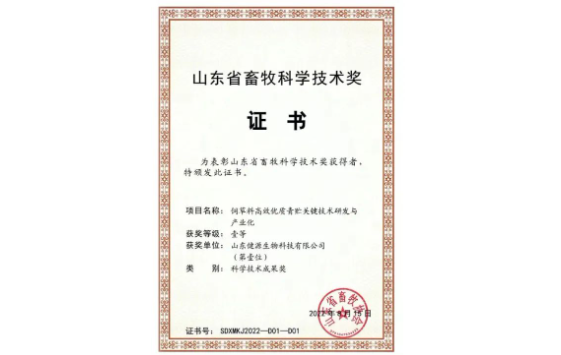 山東健源生物榮獲山東省畜牧科學(xué)技術(shù)獎(jiǎng)一等獎(jiǎng)