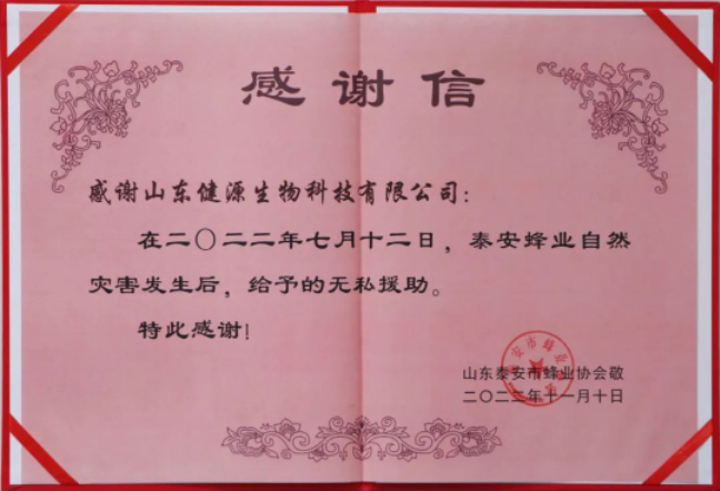 2023年4月11日,山東健源生物科技有限公司收到來自山東泰安市蜂業(yè)協(xié)會的一封感謝信和一面錦旗,感謝山東健源生物在2022年7月12日,泰安蜂業(yè)自然災(zāi)害發(fā)生后,給予的無私援助。
