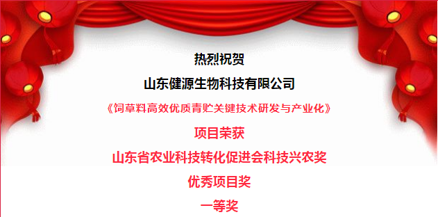 2023年5月27日, 第三屆全省科技興農(nóng)獎表彰獎勵大會在青島成功舉行,會上對在2022年度全省農(nóng)業(yè)科技成果轉(zhuǎn)化工作中涌現(xiàn)的先進(jìn)集體、先進(jìn)個人和優(yōu)秀項(xiàng)目進(jìn)行表彰,山東健源生物科技有限公司《飼草料高效優(yōu)質(zhì)青貯關(guān)鍵技術(shù)研發(fā)與產(chǎn)業(yè)化》項(xiàng)目榮獲山東省農(nóng)業(yè)科技轉(zhuǎn)化促進(jìn)會科技興農(nóng)獎優(yōu)秀項(xiàng)目獎一等獎。