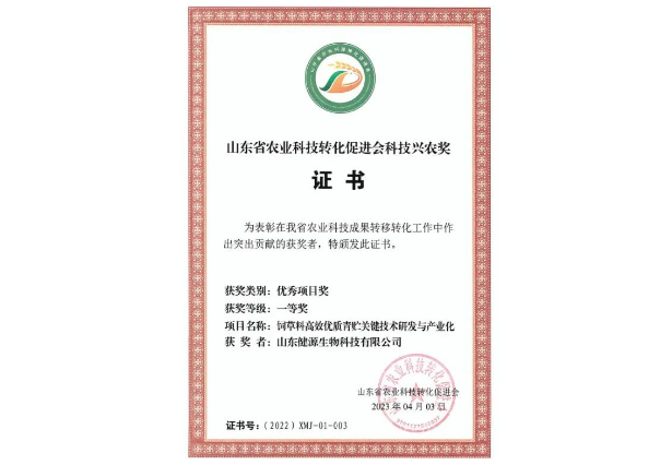 山東健源生物榮獲山東省農(nóng)業(yè)科技轉(zhuǎn)化促進(jìn)會科技興農(nóng)獎一等獎