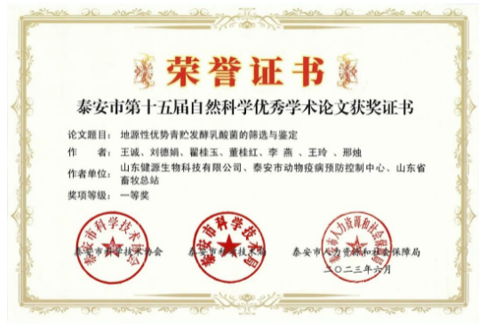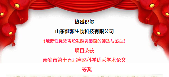 為深入推進泰安市“科創(chuàng)中國”試點市建設(shè),培養(yǎng)人才,繁榮學術(shù),鼓勵創(chuàng)新,提升泰安市廣大科技工作者的學術(shù)水平,根據(jù)泰安市人才工作計劃,由泰安市科協(xié)、泰安市科技局、泰安市人社局在全市組織開展了泰安市第十五屆自然科學優(yōu)秀學術(shù)論文評選活動。本次評選堅持公開、公平、公正的原則,采用異地評委評選的方式進行,共評出一等獎42項;二等獎70項;三等獎82項。山東健源生物科技有限公司《地源性優(yōu)勢青貯發(fā)酵乳酸菌的篩選與鑒定》項目榮獲泰安市第十五屆自然科學優(yōu)秀學術(shù)論文一等獎。