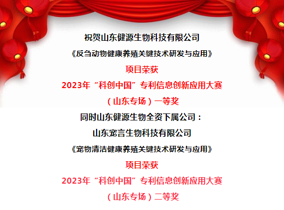 山東健源生物科技有限公司《反芻動物健康養(yǎng)殖關(guān)鍵技術(shù)研發(fā)與應(yīng)用》項(xiàng)目榮獲2023年“科創(chuàng)中國”專利信息創(chuàng)新應(yīng)用大賽(山東專場)一等獎(jiǎng),同時(shí)山東健源生物全資下屬公司:山東寵言生物科技有限公司《寵物清潔健康養(yǎng)殖關(guān)鍵技術(shù)研發(fā)與應(yīng)用》項(xiàng)目榮獲2023年“科創(chuàng)中國”專利信息創(chuàng)新應(yīng)用大賽(山東專場)二等獎(jiǎng)。