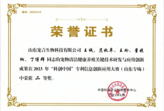 山東寵言生物科技有限公司《寵物清潔健康養(yǎng)殖關(guān)鍵技術(shù)研發(fā)與應(yīng)用》項(xiàng)目榮獲2023年科創(chuàng)中國專利信息創(chuàng)新應(yīng)用大賽(山東專場)二等獎(jiǎng)