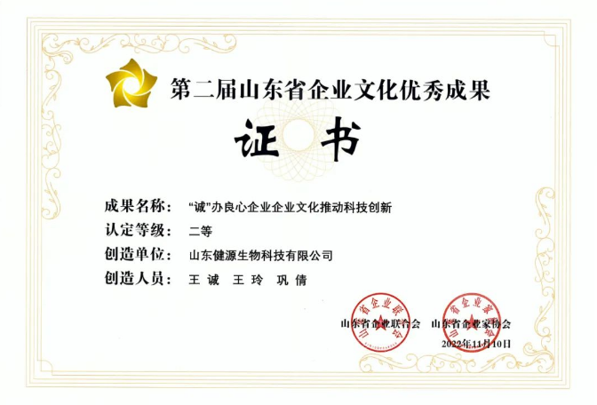 山東省企業(yè)聯(lián)合會(huì)、山東省企業(yè)家協(xié)會(huì)聯(lián)合開展了第二屆山東省企業(yè)文化優(yōu)秀成果發(fā)布活動(dòng)。通過企業(yè)申報(bào),各市企業(yè)聯(lián)合會(huì)、企業(yè)家協(xié)會(huì)和有關(guān)部門(單位)推薦,依據(jù)《山東省企業(yè)文化成果認(rèn)定規(guī)范》團(tuán)體標(biāo)準(zhǔn),按照公開、公正的原則,堅(jiān)持嚴(yán)謹(jǐn)、科學(xué)、規(guī)范的程序,經(jīng)初審、發(fā)布會(huì)現(xiàn)場(chǎng)發(fā)布、專家評(píng)審,有79項(xiàng)成果被確定為山東省企業(yè)文化優(yōu)秀成果,山東健源生物科技有限公司《“誠”辦良心企業(yè),企業(yè)文化推動(dòng)科技創(chuàng)新》企業(yè)文化成果榮獲第二屆山東省企業(yè)文化優(yōu)秀成果二等獎(jiǎng)。