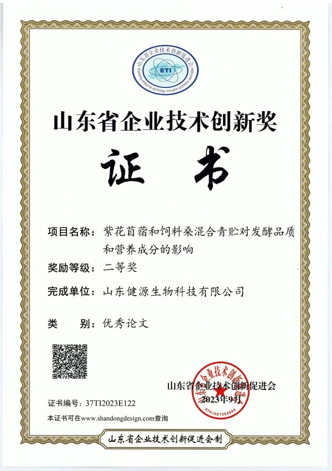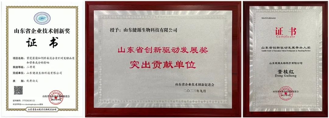 為深入貫徹落實(shí)創(chuàng)新驅(qū)動(dòng)發(fā)展戰(zhàn)略,強(qiáng)化企業(yè)技術(shù)創(chuàng)新主體地位,全面提升企業(yè)創(chuàng)新能力,選樹一批示范帶頭企業(yè)、優(yōu)秀工作者及創(chuàng)新成果,鼓勵(lì)我省企業(yè)和廣大技術(shù)創(chuàng)新工作者不斷做出新的貢獻(xiàn)。根據(jù)《山東省科學(xué)技術(shù)廳關(guān)于進(jìn)一步鼓勵(lì)和規(guī)范山東省社會(huì)力量設(shè)立科學(xué)技術(shù)獎(jiǎng)的指導(dǎo)意見》《山東省企業(yè)技術(shù)創(chuàng)新促進(jìn)會(huì)章程》和《山東省企業(yè)技術(shù)創(chuàng)新促進(jìn)會(huì)技術(shù)創(chuàng)新獎(jiǎng)獎(jiǎng)勵(lì)辦法》有關(guān)要求,結(jié)合工作實(shí)際,組織開展2023年山東省企業(yè)技術(shù)創(chuàng)新促進(jìn)會(huì)技術(shù)創(chuàng)新獎(jiǎng)評(píng)選工作。根據(jù)《山東省企業(yè)技術(shù)創(chuàng)新促進(jìn)會(huì)技術(shù)創(chuàng)新獎(jiǎng)獎(jiǎng)勵(lì)辦法》和有關(guān)評(píng)審細(xì)則,評(píng)選活動(dòng)結(jié)果公示。山東健源生物科技有限公司榮獲山東省創(chuàng)新驅(qū)動(dòng)發(fā)展獎(jiǎng)突出貢獻(xiàn)單位。公司論文《紫花苜蓿和飼料;旌锨噘A對(duì)發(fā)酵品質(zhì)和營(yíng)養(yǎng)成分的影響》榮獲山東省企業(yè)技術(shù)創(chuàng)新獎(jiǎng)優(yōu)秀論文二等獎(jiǎng)。公司研發(fā)部負(fù)責(zé)人董桂紅榮獲山東省創(chuàng)新驅(qū)動(dòng)發(fā)展帶頭人獎(jiǎng)。