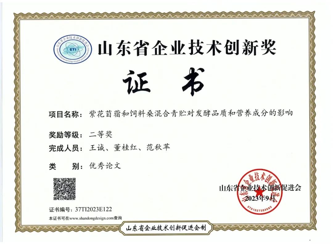 《紫花苜蓿和飼料;旌锨噘A對(duì)發(fā)酵品質(zhì)和營(yíng)養(yǎng)成分的影響》榮獲山東省企業(yè)技術(shù)創(chuàng)新獎(jiǎng)優(yōu)秀論文二等獎(jiǎng)