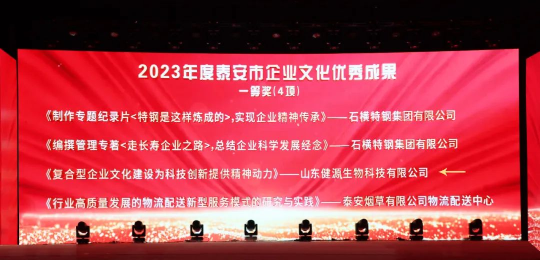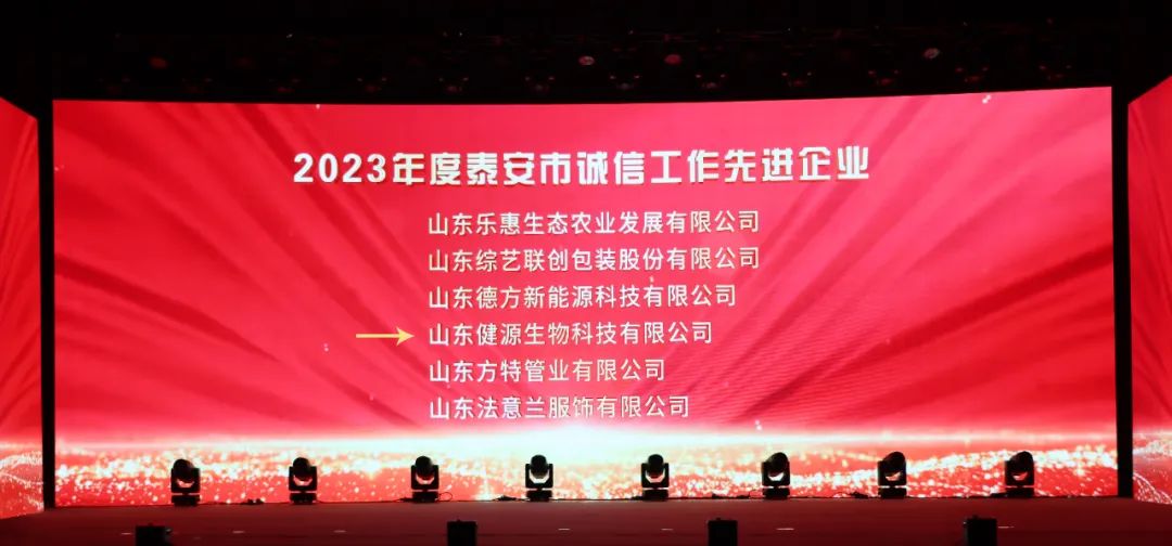 12月29日,2023迎新年銀企聯(lián)誼會暨2023年泰山企業(yè)家、泰安市“誠信工作先進企業(yè)”、 泰安市踐行社會責(zé)任愛心企業(yè)頒獎盛典隆重舉行。大會總結(jié)交流全市推進新型工業(yè)化和企業(yè)創(chuàng)新發(fā)展的成就與經(jīng)驗,表彰先進。山東健源生物科技有限公司榮獲“泰安市企業(yè)文化優(yōu)秀成果一等獎”、“泰安市誠信工作先進企業(yè)”、“泰安市踐行社會責(zé)任愛心企業(yè)”榮譽稱號。