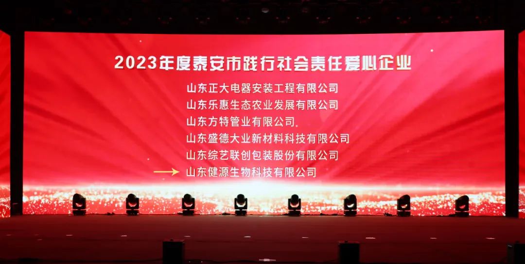 為廣泛踐行社會主義核心價值觀,弘揚高尚道德風(fēng)尚,樹立勇于擔(dān)當(dāng)、無私奉獻的新時代企業(yè)形象,經(jīng)申報并認真評選,授予山東健源生物科技有限公司等24家企業(yè)(單位)為“泰安市踐行社會責(zé)任愛心企業(yè)”稱號。