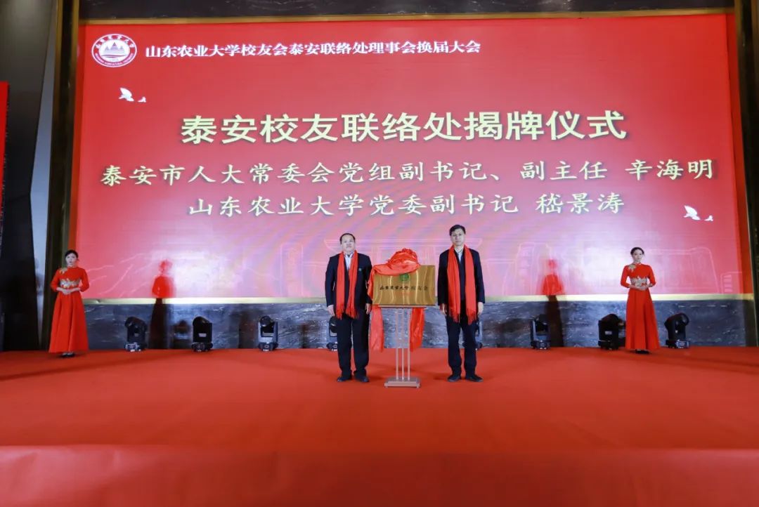 會上,泰安市人大常委會黨組副書記、副主任辛海明,山東農(nóng)業(yè)大學黨委副書記嵇景濤共同為泰安聯(lián)絡處揭牌。