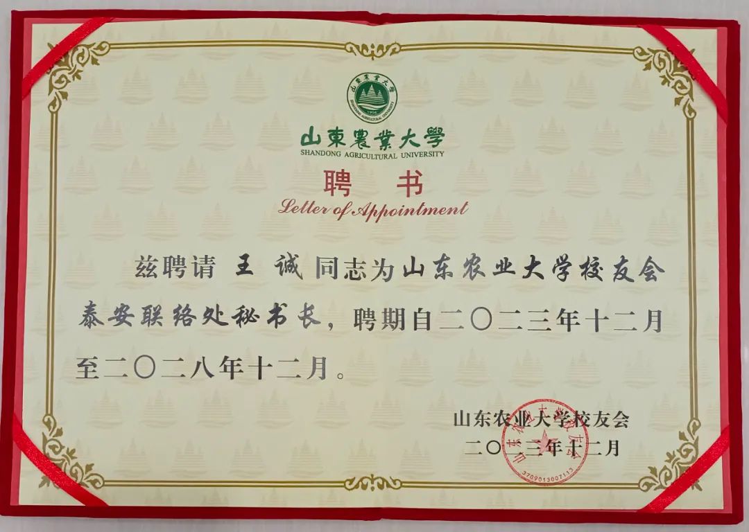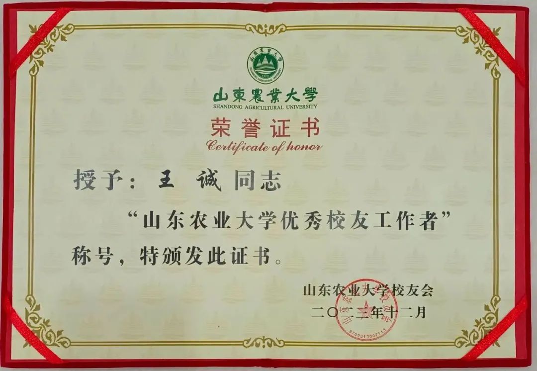 作為山東農(nóng)業(yè)大學的一名校友,健源生物董事長王誠飲水不忘思源,積極參與到泰安聯(lián)絡處換屆工作中,擔任換屆工作籌備組秘書長,本著隆重熱烈、務實節(jié)儉的原則,經(jīng)過明確分工、周密部署、精誠協(xié)作,被山東農(nóng)業(yè)大學校友會聘請為山東農(nóng)業(yè)大學校友會泰安聯(lián)絡處秘書長并授予“山東農(nóng)業(yè)大學優(yōu)秀校友工作者”榮譽稱號。