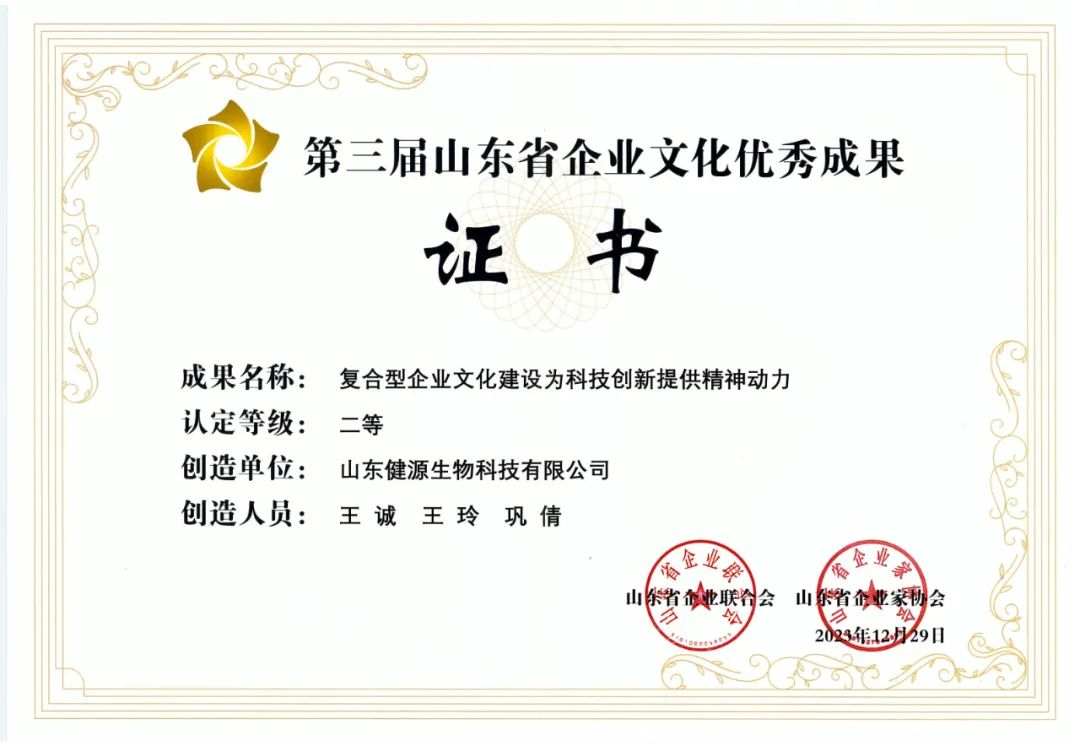山東健源生物科技有限公司報(bào)送的《復(fù)合型企業(yè)文化建設(shè)為科技創(chuàng)新提供精神動(dòng)力》企業(yè)文化建設(shè)成果榮獲二等獎(jiǎng)。