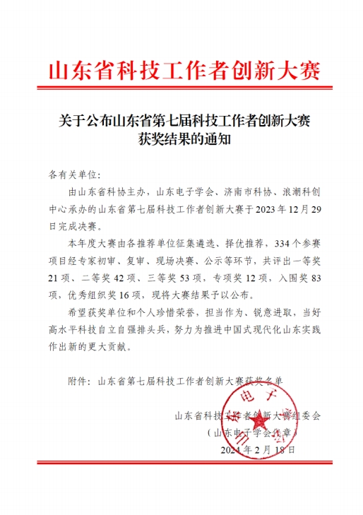 由山東省科協(xié)主辦,山東電子學(xué)會、濟南市科協(xié)、浪潮科創(chuàng)中心承辦的山東省第七屆科技工作者創(chuàng)新大賽于2023年12月29日完成決賽。本年度大賽由各市科協(xié)、省級學(xué)會、高?茀f(xié)、院士工作站等征集遴選、擇優(yōu)推薦的334項參賽項目,經(jīng)專家初審、復(fù)審、現(xiàn)場決賽、公示等環(huán)節(jié),共評出一等獎21項,二等獎42項,三等獎53項,專項獎12項,入圍獎83項,優(yōu)秀組織獎16項。