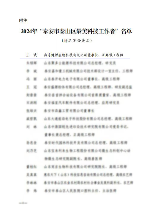 4月18日,泰安市泰山區(qū)區(qū)委宣傳部、區(qū)科協(xié)、區(qū)教體局、區(qū)科技局、區(qū)工信局、區(qū)農(nóng)業(yè)農(nóng)村局、區(qū)衛(wèi)健局聯(lián)合下發(fā)《關(guān)于公布2024年“泰安市泰山區(qū)最美科技工作者”的通知》,山東健源生物科技有限公司董事長王誠榮獲2024年“泰安市泰山區(qū)最美科技工作者”榮譽稱號。