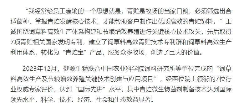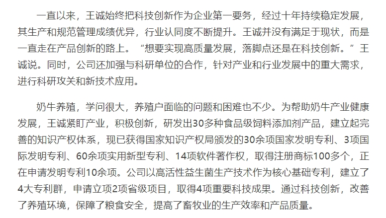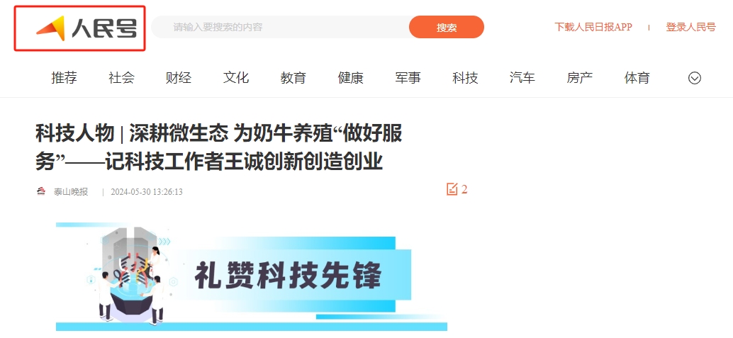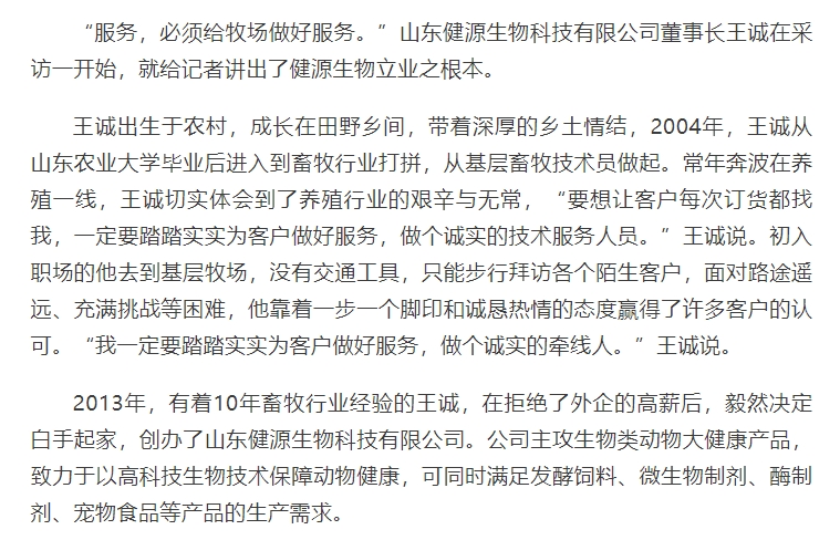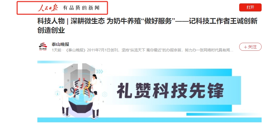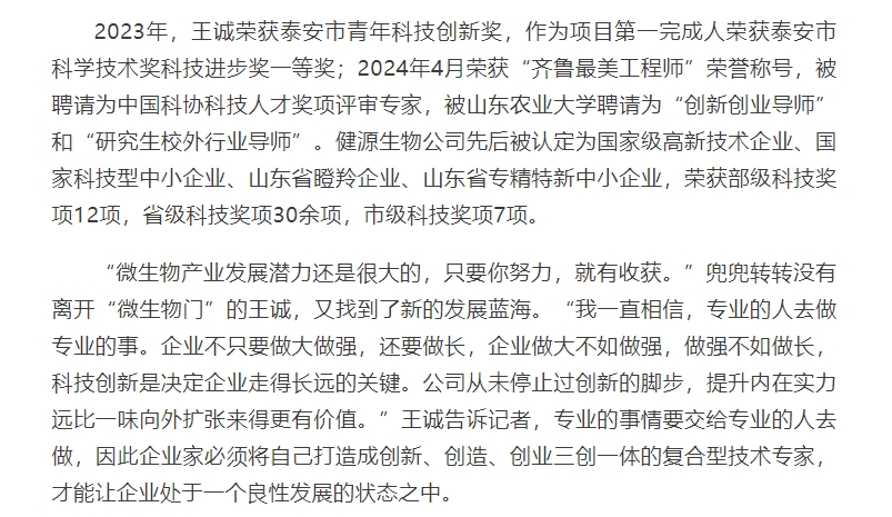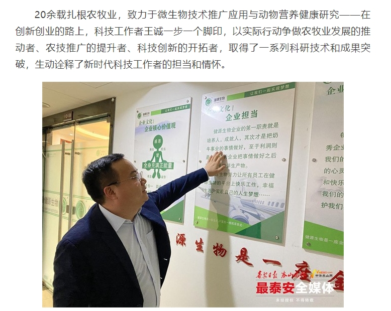 2024年5月30日迎來了第八個全國科技工作者日,山東健源生物科技有限公司董事長王誠作為泰安市科協(xié)推選的科技工作者代表接受了泰安日報記者的采訪。《深耕微生態(tài),為奶牛養(yǎng)殖“做好服務”——記科技工作者王誠創(chuàng)新創(chuàng)造創(chuàng)業(yè)之路》報道在人民日報、人民號、今日頭條、泰山晚報、最泰安全媒體等多家新聞平臺發(fā)布。