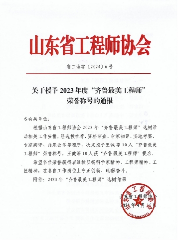 王誠董事長榮獲2023年度“齊魯最美工程師”榮譽(yù)稱號(hào)