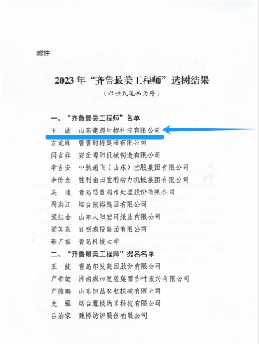 發(fā)布時(shí)間:[2024-7-5 15:51:56] 瀏覽量:3256次近日,山東省工程師協(xié)會(huì)下發(fā)關(guān)于授予2023年度“齊魯最美工程師”榮譽(yù)稱號(hào)的通報(bào),山東健源生物科技有限公司董事長王誠被授予2023年度“齊魯最美工程師”榮譽(yù)稱號(hào)。