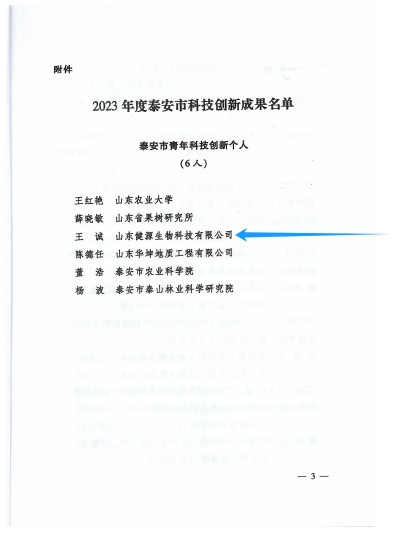 會上宣讀了《泰安市獲2023年度國家、省科學(xué)技術(shù)獎項目名單》和《泰安市人民政府關(guān)于公布2023年度泰安市科技創(chuàng)新成果名單的通知》,為2023年度省科學(xué)技術(shù)獎獲獎代表及市科技創(chuàng)新成果完成人代表頒發(fā)證書。山東健源生物科技有限公司董事長王誠榮獲泰安市青年科技創(chuàng)新個人。