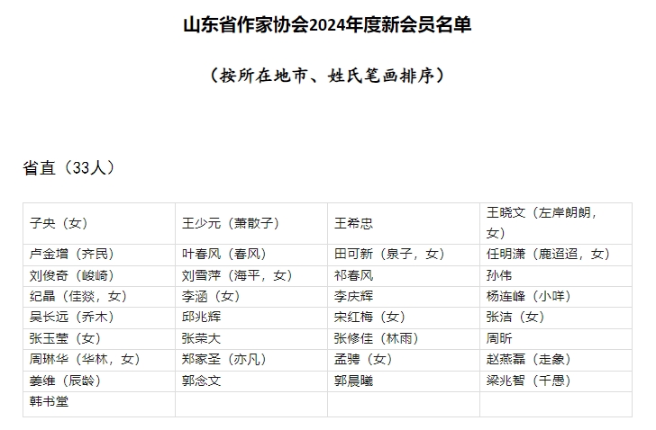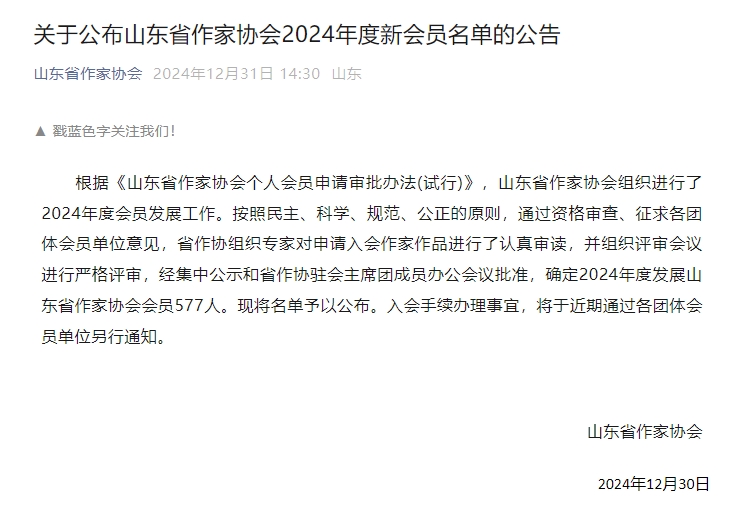 根據(jù)《山東省作家協(xié)會(huì)個(gè)人會(huì)員申請(qǐng)審批辦法(試行)》,山東省作家協(xié)會(huì)組織進(jìn)行了2024年度會(huì)員發(fā)展工作。按照民主、科學(xué)、規(guī)范、公正的原則,通過資格審查、征求各團(tuán)體會(huì)員單位意見,省作協(xié)組織專家對(duì)申請(qǐng)入會(huì)作家作品進(jìn)行了認(rèn)真審讀,并組織評(píng)審會(huì)議進(jìn)行嚴(yán)格評(píng)審,經(jīng)集中公示和省作協(xié)駐會(huì)主席團(tuán)成員辦公會(huì)議批準(zhǔn),確定2024年度發(fā)展山東省作家協(xié)會(huì)會(huì)員577人。