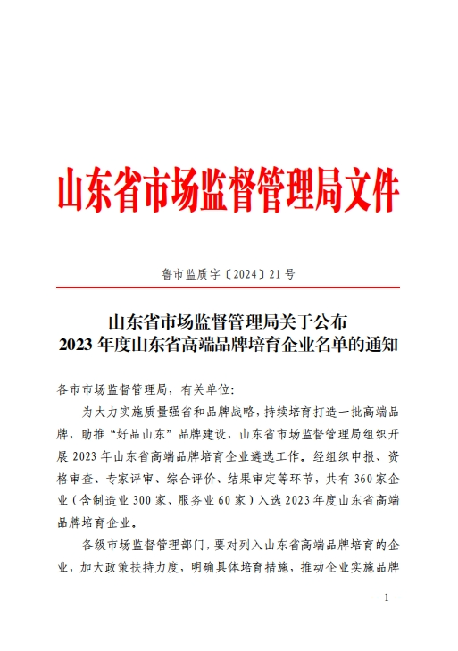 1月26日,山東省市場監(jiān)督管理局發(fā)布《關(guān)于公布2023年度山東省高端品牌培育企業(yè)名單的通知》,山東健...
