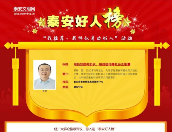 2022-7-7 熱烈祝賀我公司王誠董事長接連入選“泰安好人榜”、“山東好人”均為誠實守信類