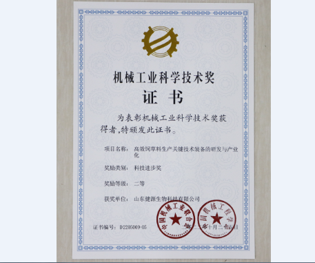 祝賀山東健源生物參與完成的《高效飼草料生產(chǎn)關(guān)鍵技術(shù)裝備的研發(fā)與產(chǎn)業(yè)化》項目榮獲2022年度機(jī)械工業(yè)科學(xué)技術(shù)獎科技進(jìn)步獎二等獎