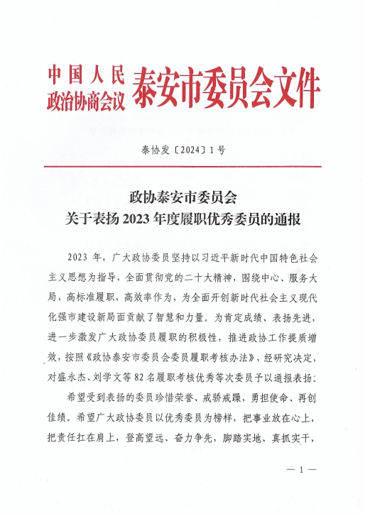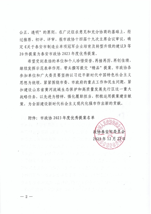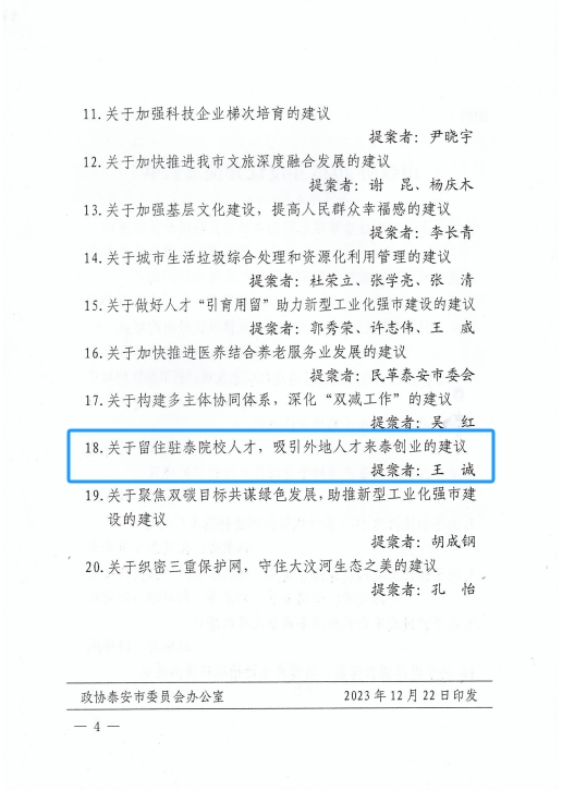 在會(huì)上,政協(xié)泰安市委員會(huì)發(fā)布了關(guān)于表?yè)P(yáng)2023年度優(yōu)秀提案的決定,王誠(chéng)董事長(zhǎng)《關(guān)于留住駐泰院校人才,吸引外地人才來(lái)泰創(chuàng)業(yè)的建議》被選為優(yōu)秀提案。