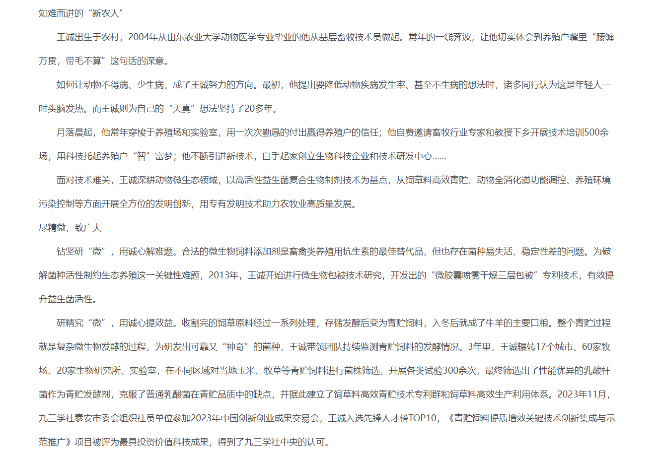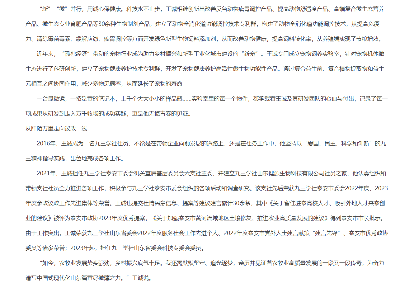 發(fā)布時間:[2024-8-7 15:16:1] 瀏覽量:3511次近日,中國人民政治協(xié)商會議山東省委員會官網(wǎng)推送《“微”而不凡的 科技“新農(nóng)人”》文章,報道山東健源生物科技有限公司董事長王誠作為“新農(nóng)人”,20多年來深耕微生態(tài)領(lǐng)域,以高活動性益生菌復(fù)合生物制劑技術(shù)為基點,從飼草料高效青貯、動物全消化道功能調(diào)控、養(yǎng)殖環(huán)境污染控制等方面全方位的發(fā)明創(chuàng)新,用專有發(fā)明技術(shù)助力農(nóng)牧業(yè)高質(zhì)量發(fā)展。而作為一名九三學(xué)社社員,王誠董事長堅持以“愛國、民主、科學(xué)和創(chuàng)新”的九三精神指導(dǎo)實踐,出色地完成各項工作。全文如下: