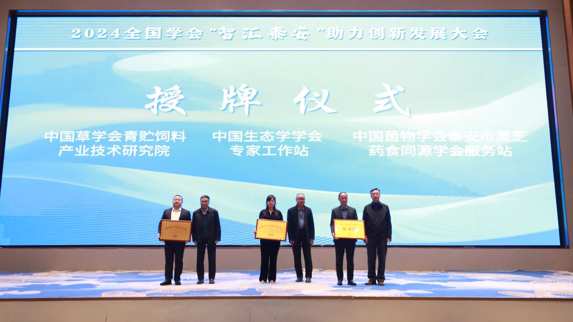 會(huì)前,中國(guó)檢驗(yàn)檢測(cè)學(xué)會(huì)等11家全國(guó)學(xué)會(huì)分別深入40余家企業(yè)實(shí)地指導(dǎo)調(diào)研,征集企業(yè)技術(shù)需求,確定了技術(shù)服務(wù)等一系列合作事項(xiàng)。與會(huì)專家領(lǐng)導(dǎo)共同為青貯飼料產(chǎn)業(yè)技術(shù)研究院、中國(guó)生態(tài)學(xué)學(xué)會(huì)專家工作站、中國(guó)菌物學(xué)會(huì)泰安市靈芝藥食同源學(xué)會(huì)服務(wù)站、山東汽車工程學(xué)會(huì)助力企業(yè)創(chuàng)新驅(qū)動(dòng)發(fā)展服務(wù)站等19個(gè)平臺(tái)授牌。中國(guó)草學(xué)會(huì)青貯飼料產(chǎn)業(yè)技術(shù)研究院落戶山東健源生物科技有限公司,中國(guó)農(nóng)業(yè)大學(xué)草業(yè)科技學(xué)院、中國(guó)草學(xué)會(huì)副理事長(zhǎng)王堃教授為健源生物授牌,健源生物董事長(zhǎng)王誠(chéng)上臺(tái)接受牌匾。
